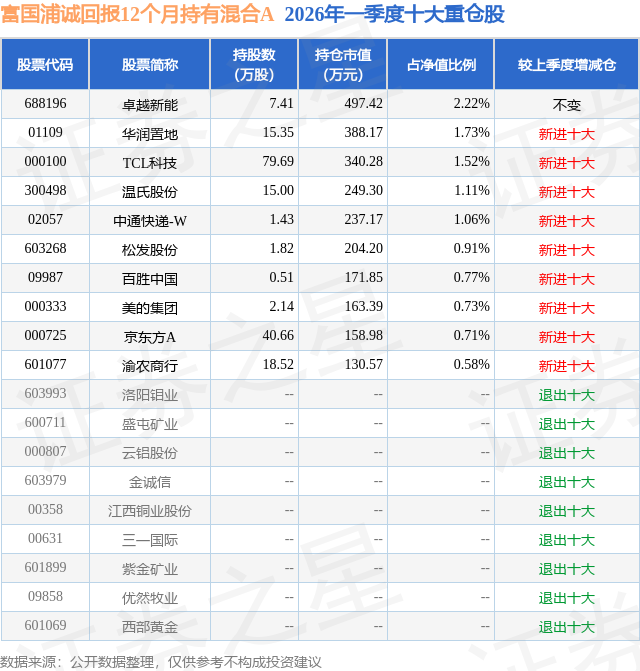 从基金规模来看,富国浦诚回报12个月持有混合A基金2026年一季度公布的基金规模为2.04亿元,较上一期规模5.91亿元变化了-3.87亿元,环比变化了-65.52%。该基金最新一期资产配置为:股票占净值比17.1%,债券占净值比52.98%,现金占净值比29.83%。从基金持仓来看,该基金当季前十大股票仓位达11.34%,第一大重仓股为卓越新能(688196),持仓占比为2.22%。