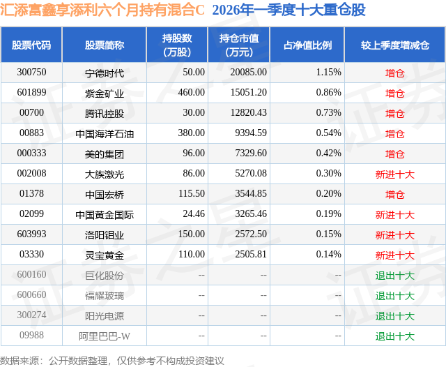 从基金规模来看,汇添富鑫享添利六个月持有混合C基金2026年一季度公布的基金规模为13.72亿元,较上一期规模4669.74万元变化了13.25亿元,环比变化了2838.28%。该基金最新一期资产配置为:股票占净值比6.62%,债券占净值比89.46%,现金占净值比0.47%。从基金持仓来看,该基金当季前十大股票仓位达4.68%,第一大重仓股为宁德时代(300750),持仓占比为1.15%。