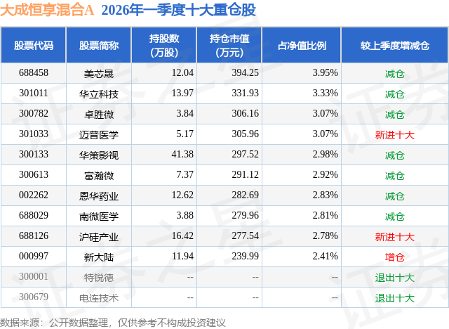 证券之星消息,日前大成恒享混合A基金公布一季报,2026年一季度最新规模0.35亿元,季度净值涨幅为-4.47%。