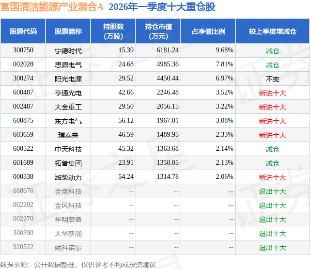 从基金规模来看,富国清洁能源产业混合A基金2026年一季度公布的基金规模为4.36亿元,较上一期规模11.7亿元变化了-7.34亿元,环比变化了-62.71%。该基金最新一期资产配置为:股票占净值比46.39%,无债券类资产,现金占净值比52.68%。从基金持仓来看,该基金当季前十大股票仓位达42.94%,第一大重仓股为宁德时代(300750),持仓占比为9.68%。