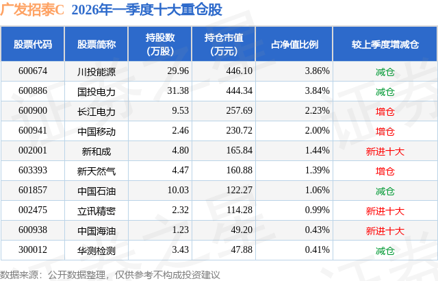 从基金规模来看,广发招泰C基金2026年一季度公布的基金规模为0.4亿元,较上一期规模4965.12万元变化了-936.92万元,环比变化了-18.87%。该基金最新一期资产配置为:股票占净值比17.65%,债券占净值比92.28%,现金占净值比1.76%。从基金持仓来看,该基金当季前十大股票仓位达17.65%,第一大重仓股为川投能源(600674),持仓占比为3.86%。