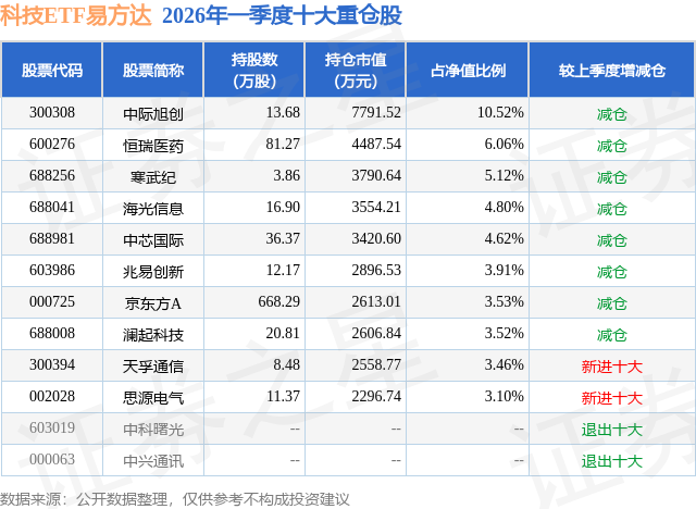 从基金规模来看,科技ETF易方达基金2026年一季度公布的基金规模为7.41亿元,较上一期规模8.92亿元变化了-1.52亿元,环比变化了-17.02%。该基金最新一期资产配置为:股票占净值比99.58%,无债券类资产,现金占净值比0.84%。从基金持仓来看,该基金当季前十大股票仓位达48.64%,第一大重仓股为中际旭创(300308),持仓占比为10.52%。