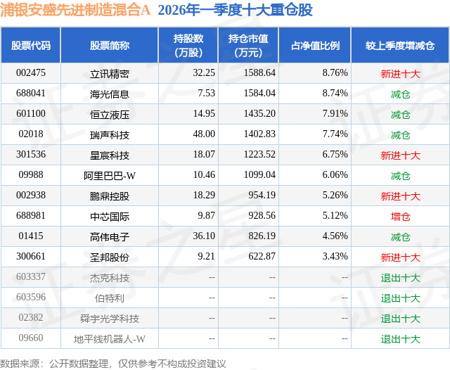 证券之星消息,日前浦银安盛先进制造混合A基金公布一季报,2026年一季度最新规模0.72亿元,季度净值涨幅为-10.84%。