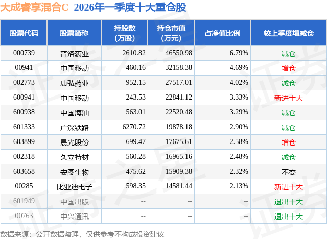 从基金规模来看,大成睿享混合C基金2026年一季度公布的基金规模为24.3亿元,较上一期规模21.14亿元变化了3.17亿元,环比变化了14.98%。该基金最新一期资产配置为:股票占净值比59.07%,债券占净值比1.61%,现金占净值比39.76%。从基金持仓来看,该基金当季前十大股票仓位达34.53%,第一大重仓股为普洛药业(000739),持仓占比为6.79%。