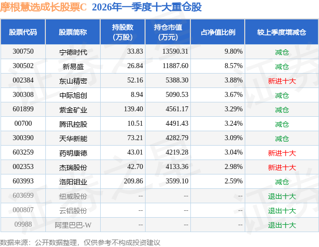 从基金规模来看,摩根慧选成长股票C基金2026年一季度公布的基金规模为2.4亿元,较上一期规模2.18亿元变化了2228.54万元,环比变化了10.24%。该基金最新一期资产配置为:股票占净值比87.79%,无债券类资产,现金占净值比11.35%。从基金持仓来看,该基金当季前十大股票仓位达44.15%,第一大重仓股为宁德时代(300750),持仓占比为9.8%。