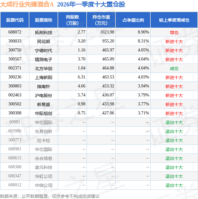 从基金规模来看,大成行业先锋混合A基金2026年一季度公布的基金规模为0.96亿元,较上一期规模1.96亿元变化了-1.0亿元,环比变化了-50.98%。该基金最新一期资产配置为:股票占净值比74.37%,无债券类资产,现金占净值比17.72%。从基金持仓来看,该基金当季前十大股票仓位达48.58%,第一大重仓股为拓荆科技(688072),持仓占比为8.9%。