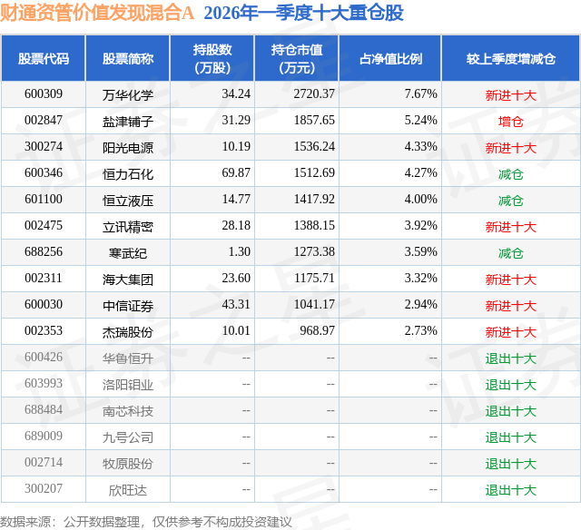 从基金规模来看,财通资管价值发现混合A基金2026年一季度公布的基金规模为2.99亿元,较上一期规模4.93亿元变化了-1.93亿元,环比变化了-39.27%。该基金最新一期资产配置为:股票占净值比83.81%,无债券类资产,现金占净值比13.94%。从基金持仓来看,该基金当季前十大股票仓位达42.01%,第一大重仓股为万华化学(600309),持仓占比为7.67%。