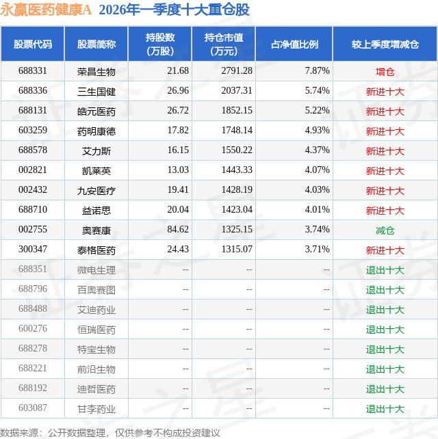 证券之星消息,日前永赢医药健康A基金公布一季报,2026年一季度最新规模0.35亿元,季度净值涨幅为7.67%。