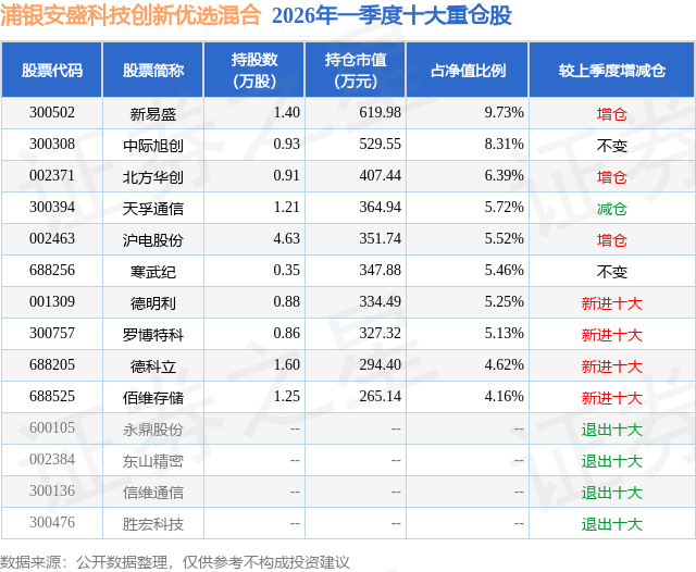 从基金规模来看,浦银安盛科技创新优选混合基金2026年一季度公布的基金规模为0.64亿元,较上一期规模4517.2万元变化了1857.78万元,环比变化了41.13%。该基金最新一期资产配置为:股票占净值比89.62%,无债券类资产,现金占净值比10.56%。从基金持仓来看,该基金当季前十大股票仓位达60.29%,第一大重仓股为新易盛(300502),持仓占比为9.73%。