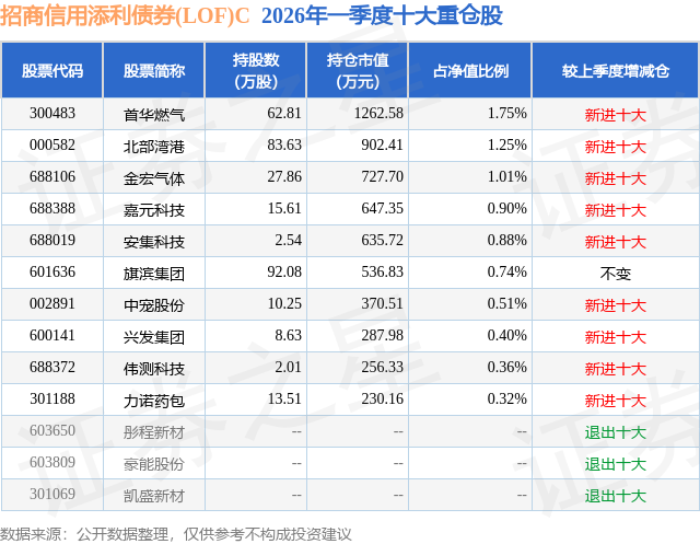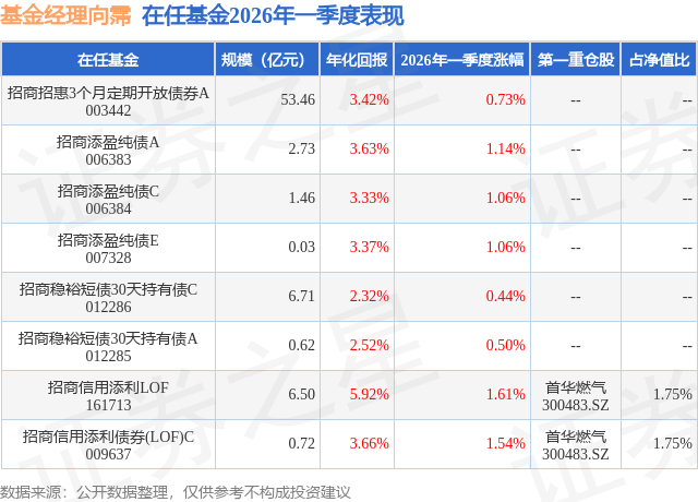 从基金规模来看,招商信用添利债券(LOF)C基金2026年一季度公布的基金规模为0.72亿元,较上一期规模1.07亿元变化了-3516.95万元,环比变化了-32.79%。该基金最新一期资产配置为:股票占净值比8.63%,债券占净值比117.93%,现金占净值比4.04%。从基金持仓来看,该基金当季前十大股票仓位达8.12%,第一大重仓股为首华燃气(300483),持仓占比为1.75%。
