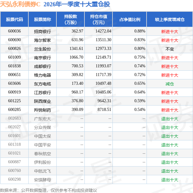 证券之星消息,日前天弘永利债券C基金公布一季报,2026年一季度最新规模18.64亿元,季度净值涨幅为1.37%。