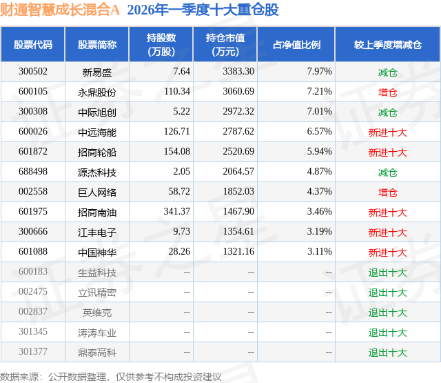 从基金规模来看,财通智慧成长混合A基金2026年一季度公布的基金规模为1.53亿元,较上一期规模1.86亿元变化了-3305.41万元,环比变化了-17.79%。该基金最新一期资产配置为:股票占净值比86.37%,无债券类资产,现金占净值比11.82%。从基金持仓来看,该基金当季前十大股票仓位达53.7%,第一大重仓股为新易盛(300502),持仓占比为7.97%。