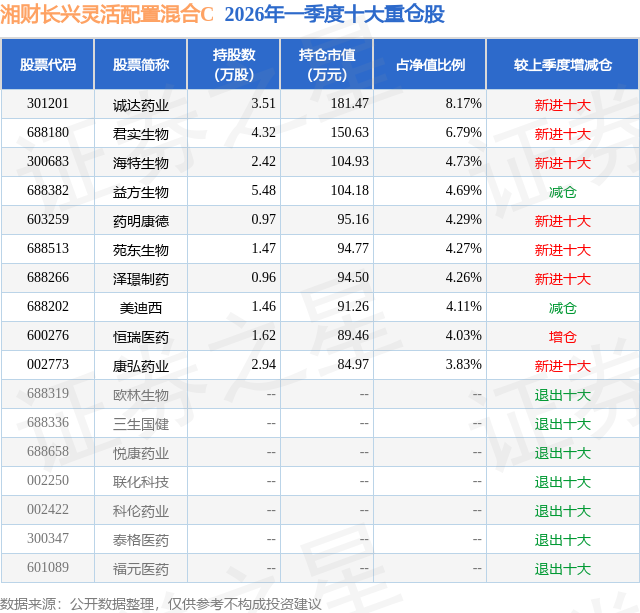 从基金规模来看,湘财长兴灵活配置混合C基金2026年一季度公布的基金规模为0.13亿元,较上一期规模2258.5万元变化了-930.95万元,环比变化了-41.22%。该基金最新一期资产配置为:股票占净值比74.19%,债券占净值比5.9%,现金占净值比9.97%。从基金持仓来看,该基金当季前十大股票仓位达49.17%,第一大重仓股为诚达药业(301201),持仓占比为8.17%。
