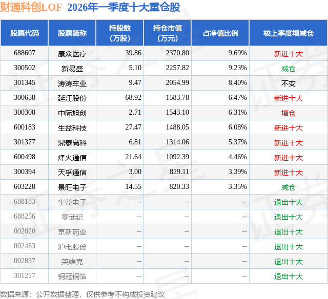 从基金规模来看,财通科创LOF基金2026年一季度公布的基金规模为2.45亿元,较上一期规模2.65亿元变化了-1991.48万元,环比变化了-7.53%。该基金最新一期资产配置为:股票占净值比93.55%,债券占净值比2.86%,现金占净值比3.16%。从基金持仓来看,该基金当季前十大股票仓位达62.75%,第一大重仓股为康众医疗(688607),持仓占比为9.69%。