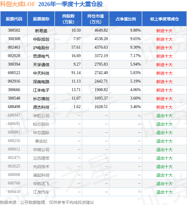 从基金规模来看,科创大成LOF基金2026年一季度公布的基金规模为4.61亿元,较上一期规模6.27亿元变化了-1.67亿元,环比变化了-26.55%。该基金最新一期资产配置为:股票占净值比92.99%,无债券类资产,现金占净值比8.26%。从基金持仓来看,该基金当季前十大股票仓位达64.08%,第一大重仓股为新易盛(300502),持仓占比为9.88%。