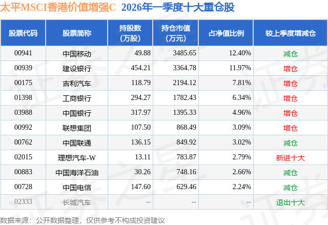 从基金规模来看,太平MSCI香港价值增强C基金2026年一季度公布的基金规模为0.27亿元,较上一期规模56.75万元变化了2661.03万元,环比变化了4689.2%。该基金最新一期资产配置为:股票占净值比91.54%,无债券类资产,现金占净值比8.63%。从基金持仓来看,该基金当季前十大股票仓位达57.28%,第一大重仓股为中国移动(00941),持仓占比为12.4%。