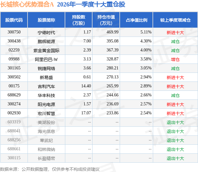 从基金规模来看,长城核心优势混合A基金2026年一季度公布的基金规模为0.91亿元,较上一期规模8268.1万元变化了824.8万元,环比变化了9.98%。该基金最新一期资产配置为:股票占净值比81.28%,无债券类资产,现金占净值比25.76%。从基金持仓来看,该基金当季前十大股票仓位达33.64%,第一大重仓股为宁德时代(300750),持仓占比为5.11%。