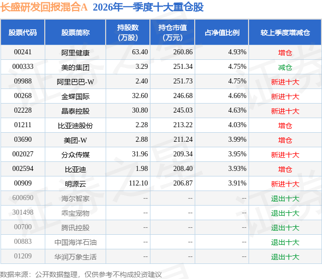 从基金规模来看,长盛研发回报混合A基金2026年一季度公布的基金规模为0.38亿元,较上一期规模4716.13万元变化了-900.97万元,环比变化了-19.1%。该基金最新一期资产配置为:股票占净值比78.95%,无债券类资产,现金占净值比54.33%。从基金持仓来看,该基金当季前十大股票仓位达43.53%,第一大重仓股为阿里健康(00241),持仓占比为4.93%。