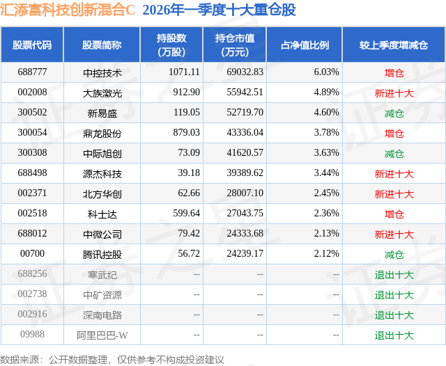 证券之星消息,日前汇添富科技创新混合C基金公布一季报,2026年一季度最新规模43.0亿元,季度净值涨幅为-0.88%。