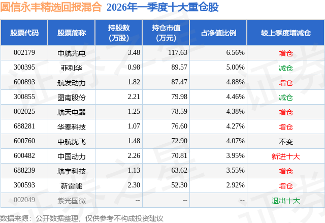 从基金规模来看,圆信永丰精选回报混合基金2026年一季度公布的基金规模为0.18亿元,较上一期规模3774.9万元变化了-1982.65万元,环比变化了-52.52%。该基金最新一期资产配置为:股票占净值比88.08%,债券占净值比6.21%,现金占净值比5.86%。从基金持仓来看,该基金当季前十大股票仓位达44.04%,第一大重仓股为中航光电(002179),持仓占比为6.56%。