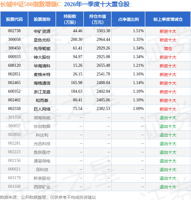 从基金规模来看,长城中证500指数增强C基金2026年一季度公布的基金规模为13.51亿元,较上一期规模7.3亿元变化了6.21亿元,环比变化了85.05%。该基金最新一期资产配置为:股票占净值比93.2%,债券占净值比4.16%,现金占净值比1.47%。从基金持仓来看,该基金当季前十大股票仓位达12.34%,第一大重仓股为中矿资源(002738),持仓占比为1.51%。