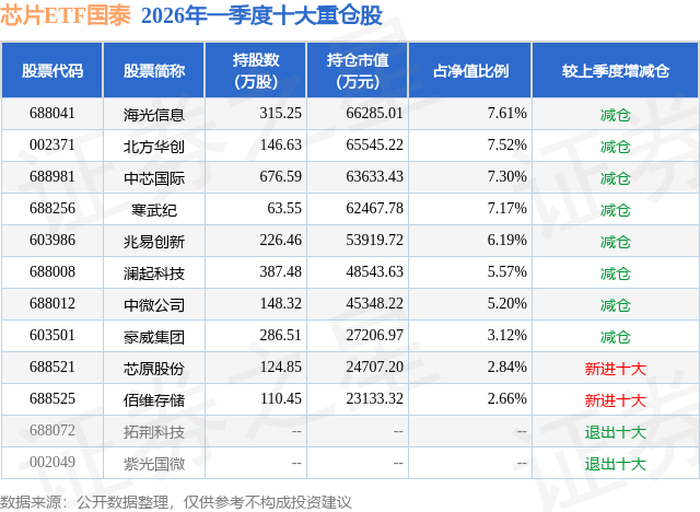 从基金规模来看,芯片ETF国泰基金2026年一季度公布的基金规模为87.13亿元,较上一期规模97.91亿元变化了-10.79亿元,环比变化了-11.02%。该基金最新一期资产配置为:股票占净值比99.73%,无债券类资产,现金占净值比0.27%。从基金持仓来看,该基金当季前十大股票仓位达55.18%,第一大重仓股为海光信息(688041),持仓占比为7.61%。