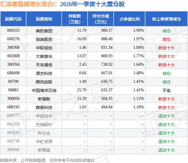证券之星消息,日前汇添富稳健增长混合C基金公布一季报,2026年一季度最新规模1.79亿元,季度净值涨幅为1.28%。