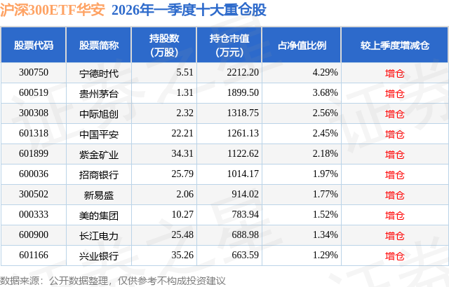 从基金规模来看,沪深300ETF华安基金2026年一季度公布的基金规模为5.16亿元,较上一期规模5.09亿元变化了675.08万元,环比变化了1.33%。该基金最新一期资产配置为:股票占净值比98.14%,无债券类资产,现金占净值比1.72%。从基金持仓来看,该基金当季前十大股票仓位达23.05%,第一大重仓股为宁德时代(300750),持仓占比为4.29%。