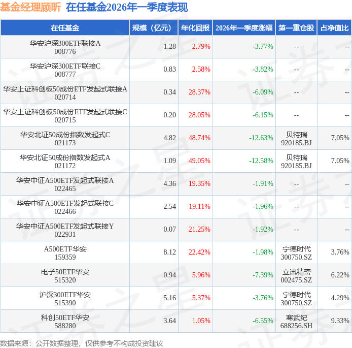 证券之星消息,日前沪深300ETF华安基金公布一季报,2026年一季度最新规模5.16亿元,季度净值涨幅为-3.76%。