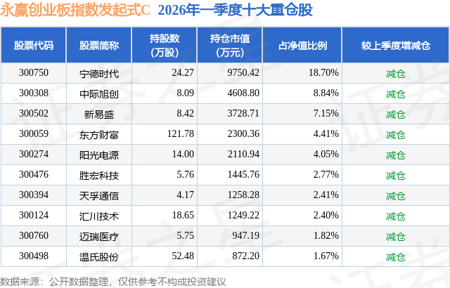 从基金规模来看,永赢创业板指数发起式C基金2026年一季度公布的基金规模为3.21亿元,较上一期规模3.85亿元变化了-6477.66万元,环比变化了-16.81%。该基金最新一期资产配置为:股票占净值比94.85%,债券占净值比2.92%,现金占净值比2.71%。从基金持仓来看,该基金当季前十大股票仓位达54.22%,第一大重仓股为宁德时代(300750),持仓占比为18.7%。