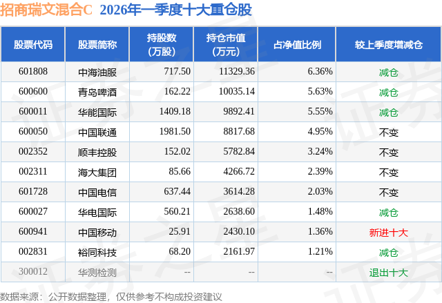 从基金规模来看,招商瑞文混合C基金2026年一季度公布的基金规模为4.83亿元,较上一期规模16.93亿元变化了-12.11亿元,环比变化了-71.49%。该基金最新一期资产配置为:股票占净值比38.91%,债券占净值比59.0%,现金占净值比2.48%。从基金持仓来看,该基金当季前十大股票仓位达34.2%,第一大重仓股为中海油服(601808),持仓占比为6.36%。