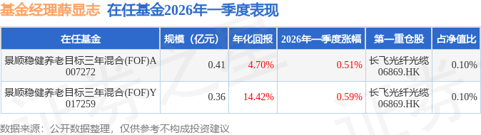 证券之星消息,日前景顺稳健养老目标三年混合(FOF)A基金公布一季报,2026年一季度最新规模0.41亿元,季度净值涨幅为0.51%。