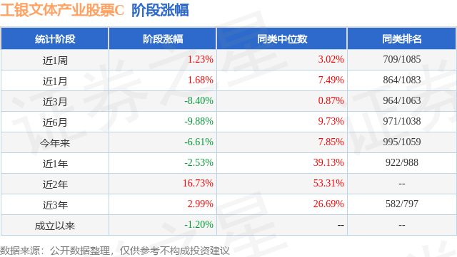 从业绩表现来看,工银文体产业股票C基金过去一年净值涨幅为-2.53%,在同类基金中排名922/988,同类基金过去一年净值涨幅中位数为39.13%。而基金过去一年的最大回撤为-18.43%,成立以来的最大回撤为-40.3%。