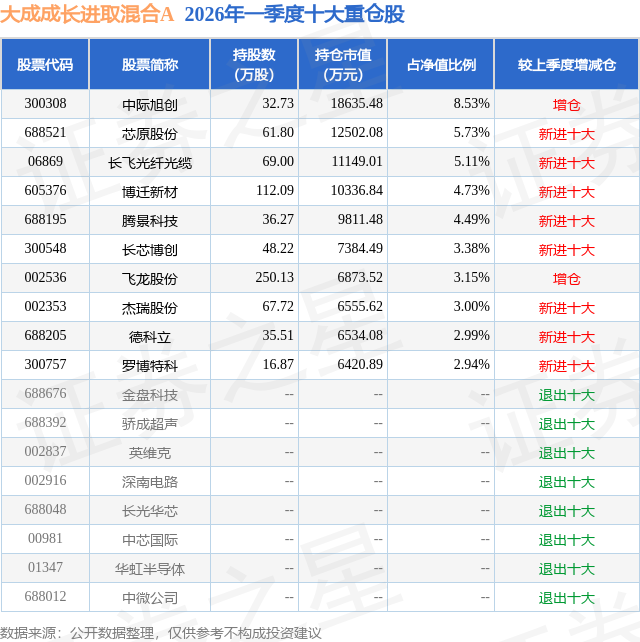 从基金规模来看,大成成长进取混合A基金2026年一季度公布的基金规模为6.87亿元,较上一期规模4.58亿元变化了2.3亿元,环比变化了50.25%。该基金最新一期资产配置为:股票占净值比85.89%,无债券类资产,现金占净值比14.58%。从基金持仓来看,该基金当季前十大股票仓位达44.05%,第一大重仓股为中际旭创(300308),持仓占比为8.53%。