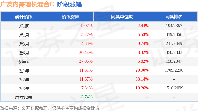 从业绩表现来看,广发内需增长混合C基金过去一年净值涨幅为11.81%,在同类基金中排名1709/2296,同类基金过去一年净值涨幅中位数为29.9%。而基金过去一年的最大回撤为-17.07%,成立以来的最大回撤为-35.87%。