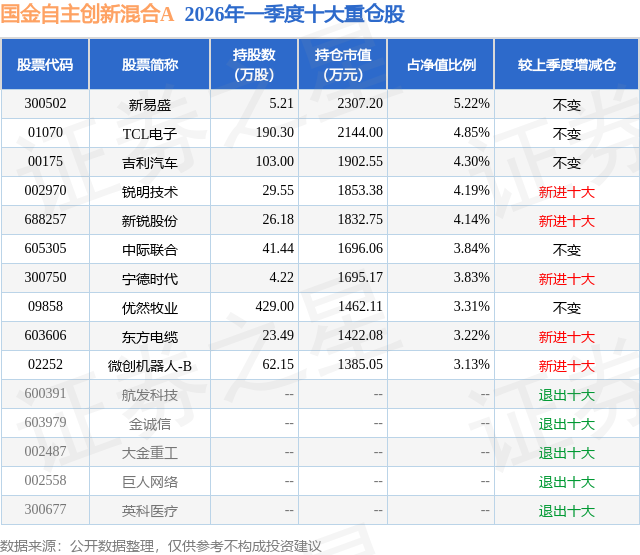 从基金规模来看,国金自主创新混合A基金2026年一季度公布的基金规模为2.29亿元,较上一期规模2.14亿元变化了1507.41万元,环比变化了7.03%。该基金最新一期资产配置为:股票占净值比95.01%,债券占净值比3.6%,现金占净值比1.68%。从基金持仓来看,该基金当季前十大股票仓位达40.03%,第一大重仓股为新易盛(300502),持仓占比为5.22%。