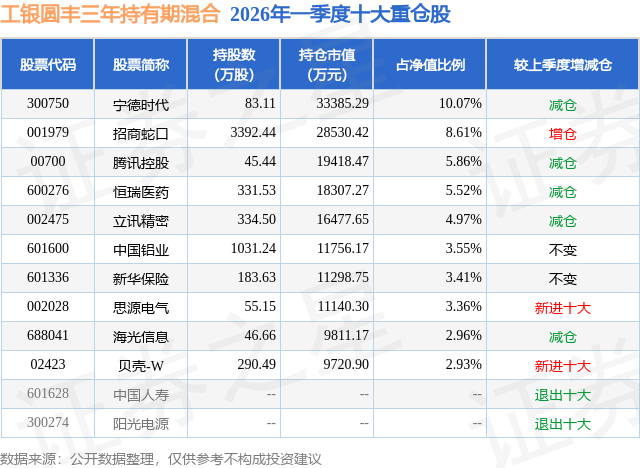 从基金规模来看,工银圆丰三年持有期混合基金2026年一季度公布的基金规模为33.15亿元,较上一期规模44.52亿元变化了-11.36亿元,环比变化了-25.53%。该基金最新一期资产配置为:股票占净值比88.64%,无债券类资产,现金占净值比11.74%。从基金持仓来看,该基金当季前十大股票仓位达51.24%,第一大重仓股为宁德时代(300750),持仓占比为10.07%。
