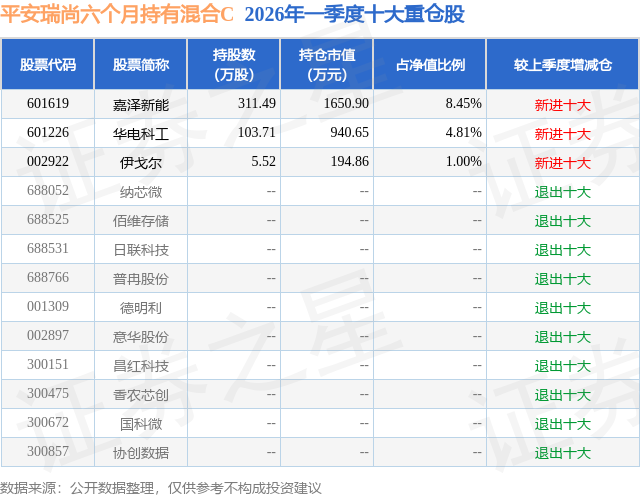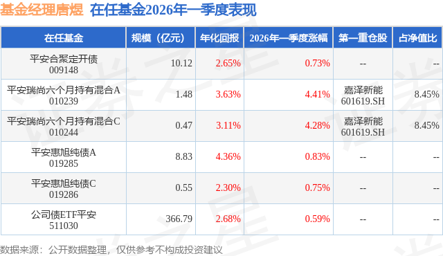 从基金规模来看,平安瑞尚六个月持有混合C基金2026年一季度公布的基金规模为0.47亿元,较上一期规模938.18万元变化了3788.54万元,环比变化了403.82%。该基金最新一期资产配置为:股票占净值比14.25%,债券占净值比82.92%,现金占净值比6.84%。从基金持仓来看,该基金当季前十大股票仓位达14.26%,第一大重仓股为嘉泽新能(601619),持仓占比为8.45%。