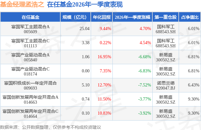证券之星消息,日前富国军工主题混合C基金公布一季报,2026年一季度最新规模3.38亿元,季度净值涨幅为4.54%。