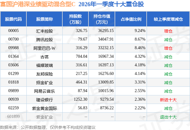 从基金规模来看,富国沪港深业绩驱动混合型C基金2026年一季度公布的基金规模为14.63亿元,较上一期规模11.27亿元变化了3.36亿元,环比变化了29.84%。该基金最新一期资产配置为:股票占净值比84.82%,无债券类资产,现金占净值比16.44%。从基金持仓来看,该基金当季前十大股票仓位达49.45%,第一大重仓股为汇丰控股(00005),持仓占比为9.24%。