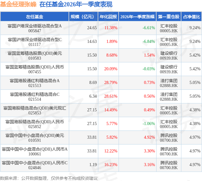 证券之星消息,日前富国沪港深业绩驱动混合型C基金公布一季报,2026年一季度最新规模14.63亿元,季度净值涨幅为-6.84%。
