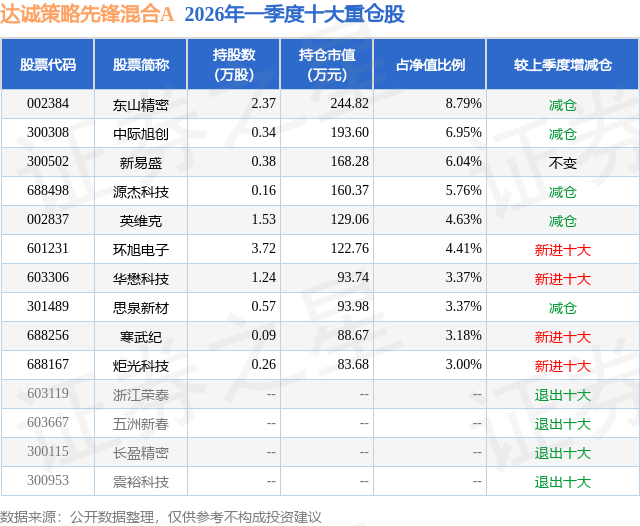 从基金规模来看,达诚策略先锋混合A基金2026年一季度公布的基金规模为0.1亿元,较上一期规模1933.02万元变化了-898.19万元,环比变化了-46.47%。该基金最新一期资产配置为:股票占净值比85.42%,无债券类资产,现金占净值比14.94%。从基金持仓来看,该基金当季前十大股票仓位达49.5%,第一大重仓股为东山精密(002384),持仓占比为8.79%。