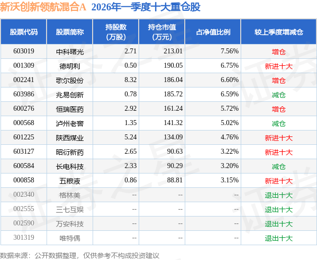 从基金规模来看,新沃创新领航混合A基金2026年一季度公布的基金规模为0.11亿元,较上一期规模1243.6万元变化了-171.49万元,环比变化了-13.79%。该基金最新一期资产配置为:股票占净值比72.76%,无债券类资产,现金占净值比27.45%。从基金持仓来看,该基金当季前十大股票仓位达52.57%,第一大重仓股为中科曙光(603019),持仓占比为7.56%。