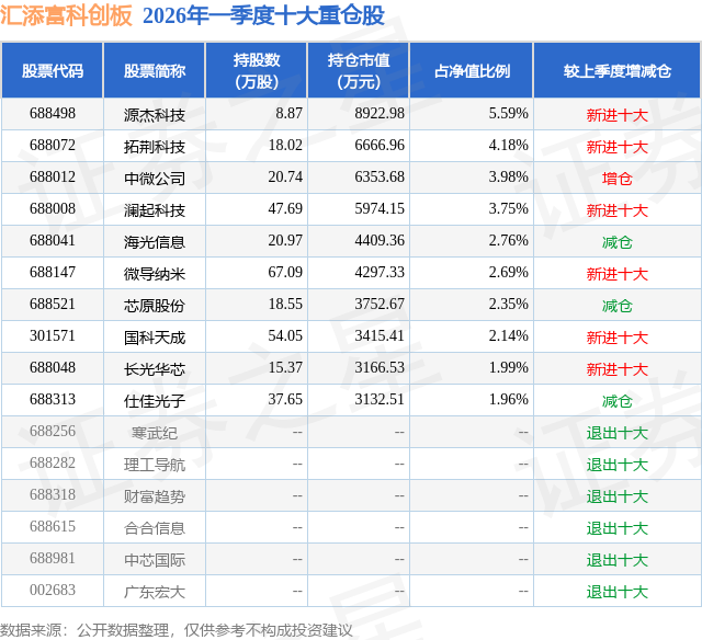 从基金规模来看,汇添富科创板基金2026年一季度公布的基金规模为15.95亿元,较上一期规模12.53亿元变化了3.42亿元,环比变化了27.27%。该基金最新一期资产配置为:股票占净值比82.21%,无债券类资产,现金占净值比17.29%。从基金持仓来看,该基金当季前十大股票仓位达31.39%,第一大重仓股为源杰科技(688498),持仓占比为5.59%。