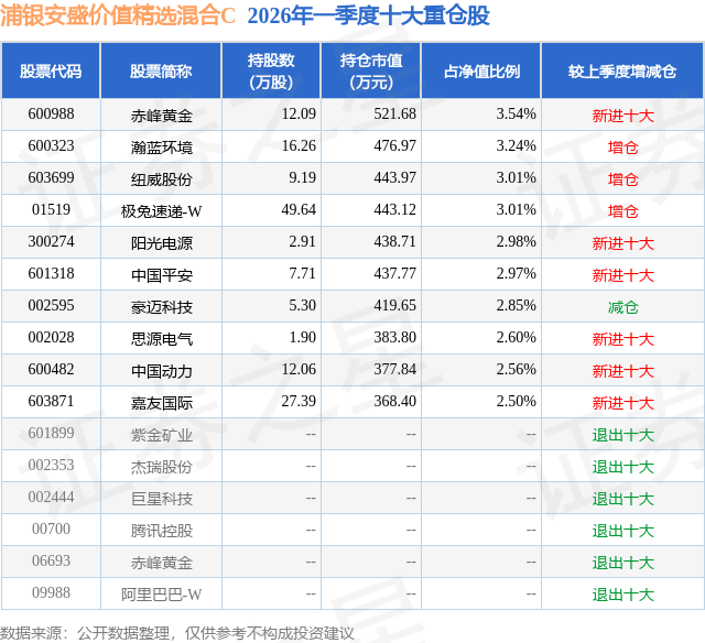 从基金规模来看,浦银安盛价值精选混合C基金2026年一季度公布的基金规模为0.22亿元,较上一期规模2817.0万元变化了-630.27万元,环比变化了-22.37%。该基金最新一期资产配置为:股票占净值比81.59%,债券占净值比6.36%,现金占净值比11.35%。从基金持仓来看,该基金当季前十大股票仓位达29.26%,第一大重仓股为赤峰黄金(600988),持仓占比为3.54%。