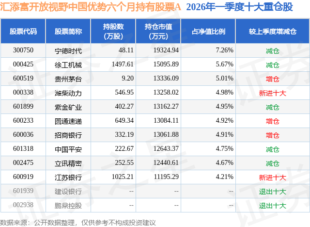 从基金规模来看,汇添富开放视野中国优势六个月持有股票A基金2026年一季度公布的基金规模为22.54亿元,较上一期规模23.49亿元变化了-9493.24万元,环比变化了-4.04%。该基金最新一期资产配置为:股票占净值比84.48%,债券占净值比5.33%,现金占净值比7.29%。从基金持仓来看,该基金当季前十大股票仓位达51.33%,第一大重仓股为宁德时代(300750),持仓占比为7.26%。