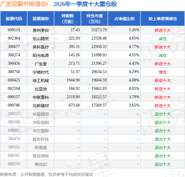 从基金规模来看,广发双擎升级混合C基金2026年一季度公布的基金规模为1.56亿元,较上一期规模2.46亿元变化了-9063.26万元,环比变化了-36.8%。该基金最新一期资产配置为:股票占净值比93.47%,债券占净值比0.73%,现金占净值比6.13%。从基金持仓来看,该基金当季前十大股票仓位达43.74%,第一大重仓股为贵州茅台(600519),持仓占比为5.26%。