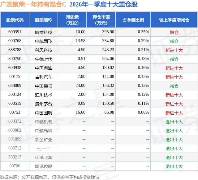 从基金规模来看,广发聚荣一年持有混合C基金2026年一季度公布的基金规模为2.13亿元,较上一期规模2.2亿元变化了-691.84万元,环比变化了-3.15%。该基金最新一期资产配置为:股票占净值比3.88%,债券占净值比92.11%,现金占净值比3.08%。从基金持仓来看,该基金当季前十大股票仓位达1.73%,第一大重仓股为航发科技(600391),持仓占比为0.35%。