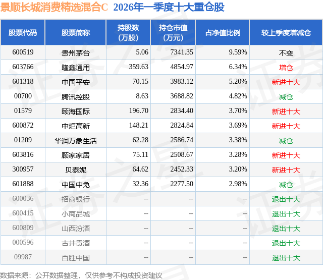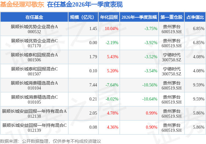 证券之星消息,日前景顺长城消费精选混合C基金公布一季报,2026年一季度最新规模0.21亿元,季度净值涨幅为-10.64%。
