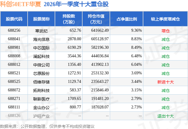 从基金规模来看,科创50ETF华夏基金2026年一季度公布的基金规模为685.48亿元,较上一期规模760.22亿元变化了-74.74亿元,环比变化了-9.83%。该基金最新一期资产配置为:股票占净值比99.57%,无债券类资产,现金占净值比0.59%。从基金持仓来看,该基金当季前十大股票仓位达55.0%,第一大重仓股为寒武纪(688256),持仓占比为9.36%。